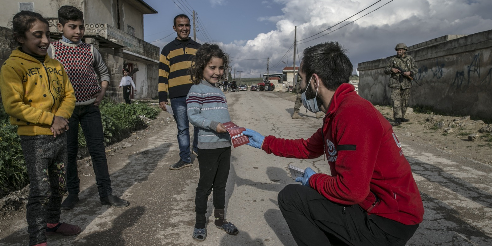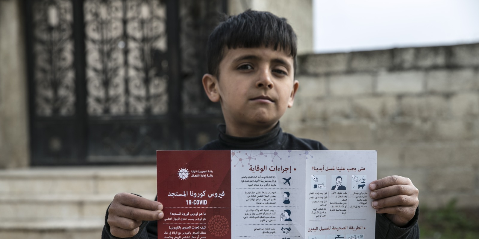 İletişim Başkanlığının yeni tip koronavirüs (Kovid-19) salgınından korunmaya ilişkin hazırladığı Arapça broşürler, Suriye’nin kuzeyinde Zeytin Dalı, Fırat Kalkanı ve Barış Pınarı Harekatı bölgelerinde ve geçici barınma merkezlerinde dağıtılıyor.