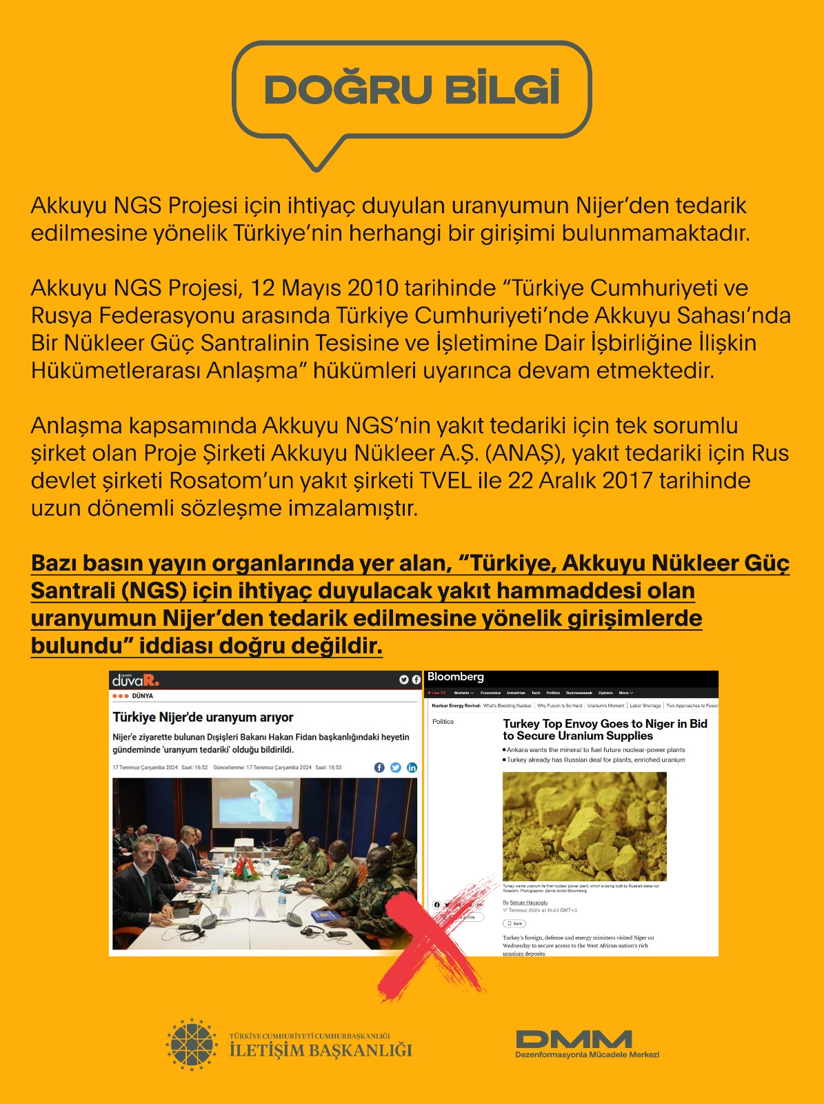 Bazı basın yayın organlarında yer alan “Türkiye, Akkuyu Nükleer Güç Santrali (NGS) için ihtiyaç duyulacak yakıt hammaddesi olan uranyumun Nijer’den tedarik edilmesine yönelik girişimlerde bulundu” iddiası doğru değildir.
