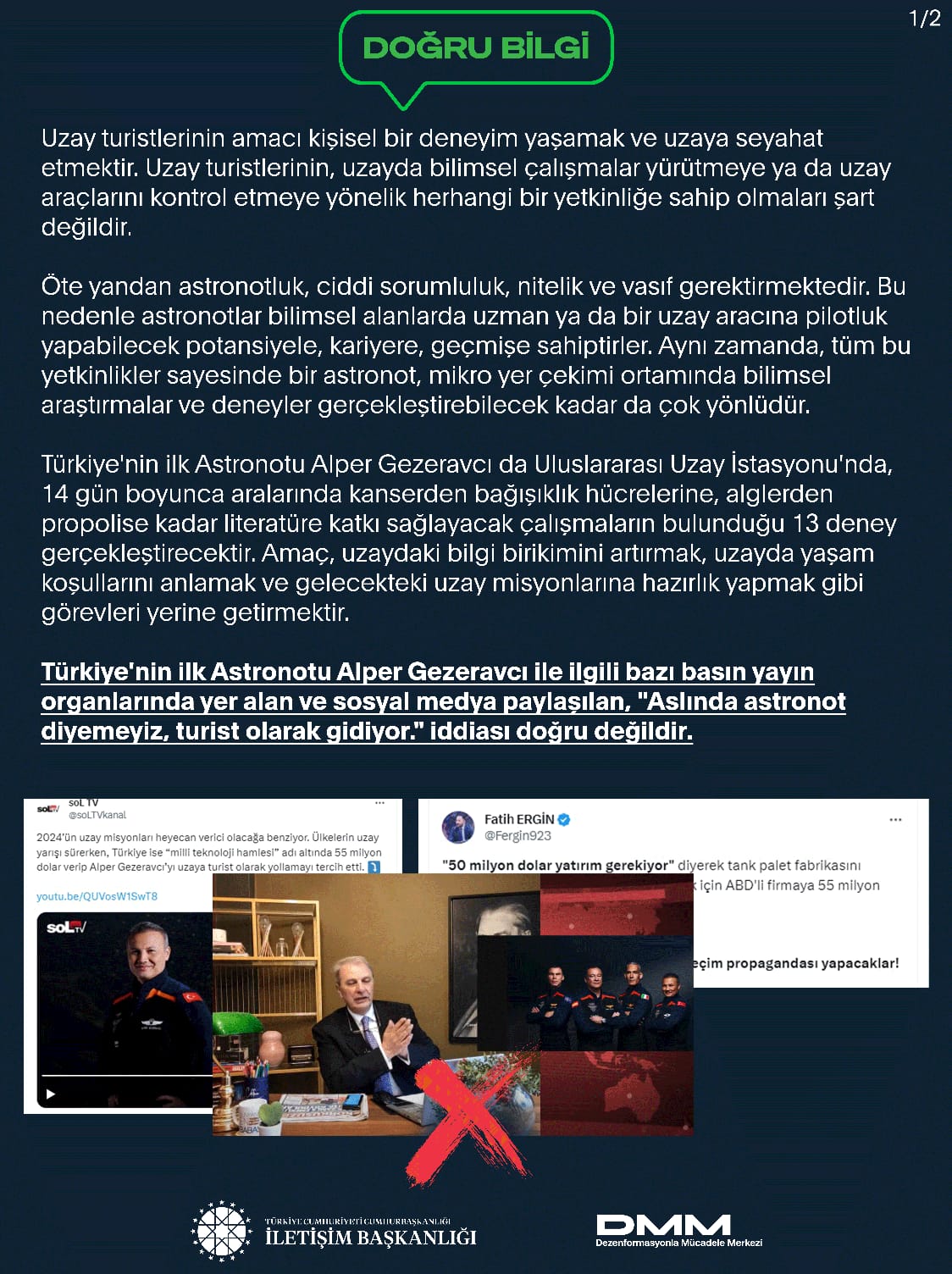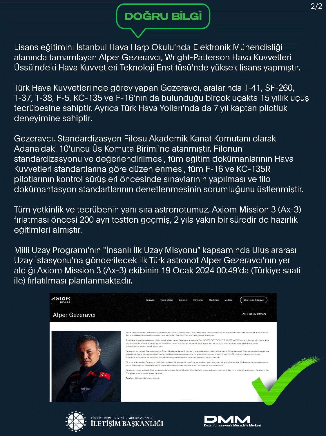 Türkiye'nin ilk Astronotu Alper Gezeravcı ile ilgili bazı basın yayın organlarında yer alan ve sosyal medyada paylaşılan "Aslında astronot diyemeyiz, turist olarak gidiyor." iddiası doğru değildir.