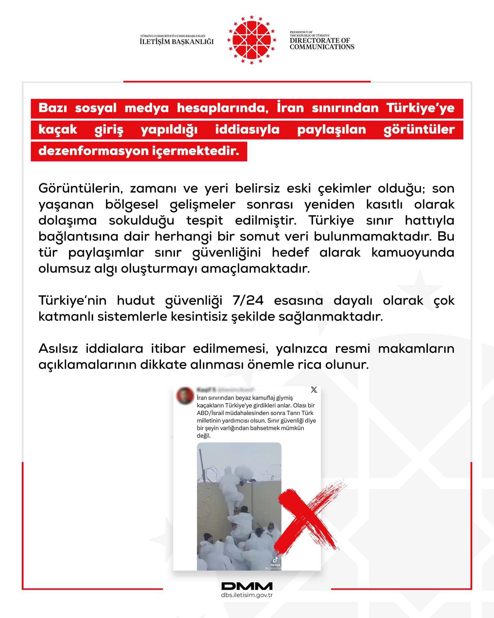Öte yandan bazı sosyal medya hesaplarında, İran sınırından Türkiye’ye kaçak giriş yapıldığı iddiasıyla paylaşılan görüntüler dezenformasyon içermektedir.