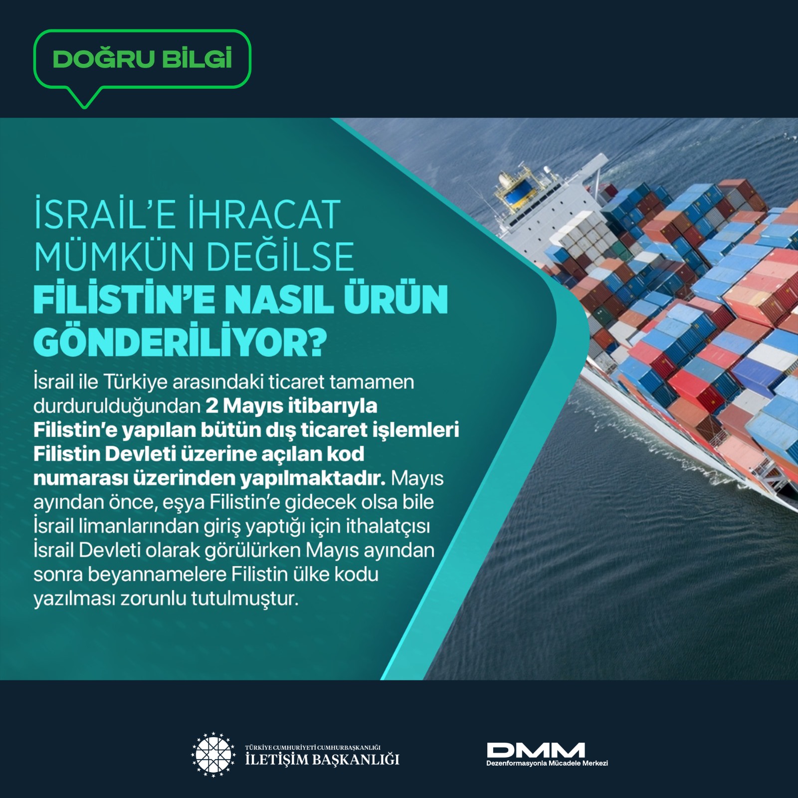 Bazı basın yayın organlarında yer alan ve sosyal medyada paylaşılan, "Türkiye'nin İsrail ile ticareti devam ediyor" iddiası doğru değildir.