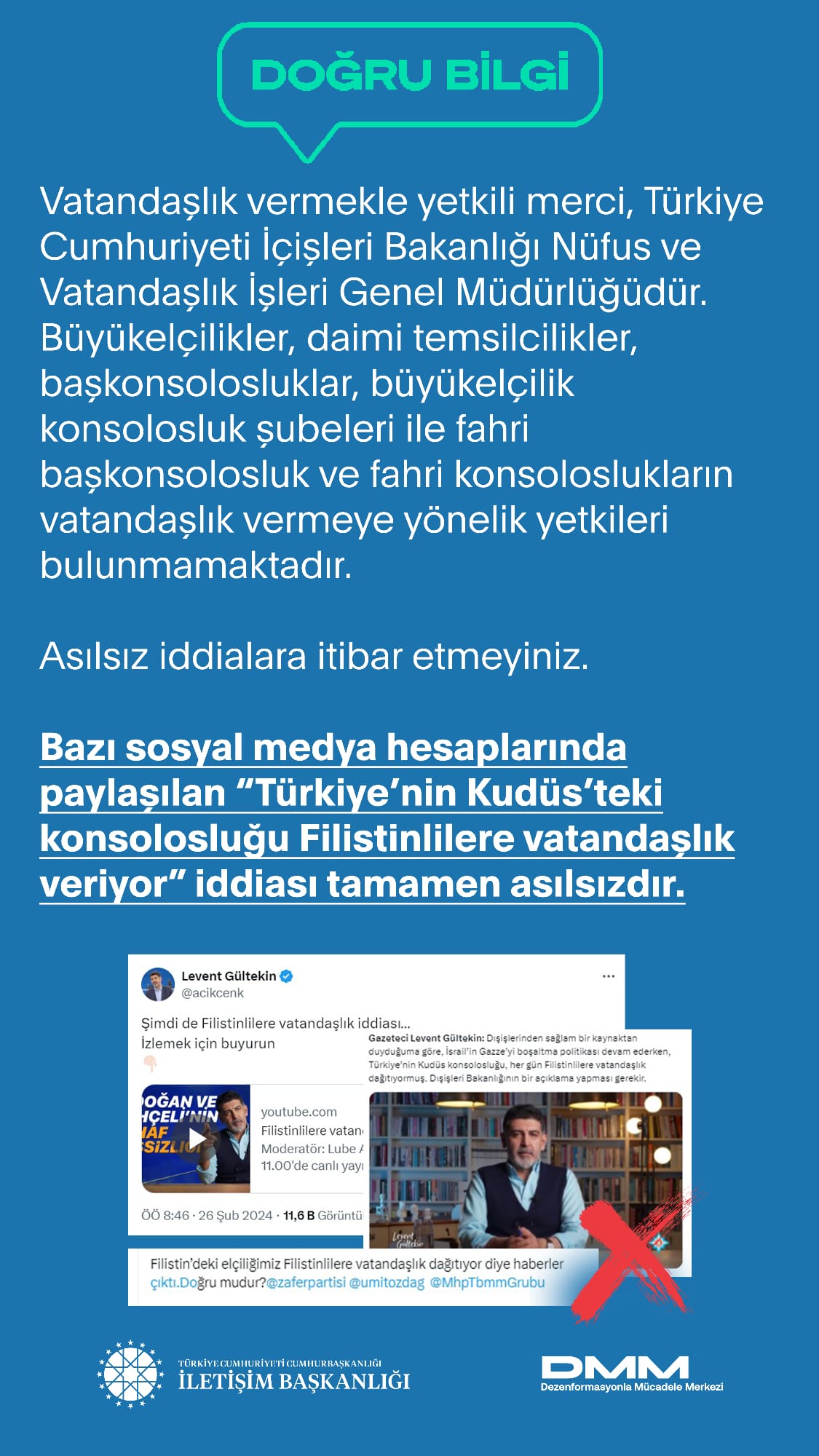 Bazı sosyal medya hesaplarında paylaşılan “Türkiye’nin Kudüs’teki konsolosluğu Filistinlilere vatandaşlık veriyor” iddiası tamamen asılsızdır.
