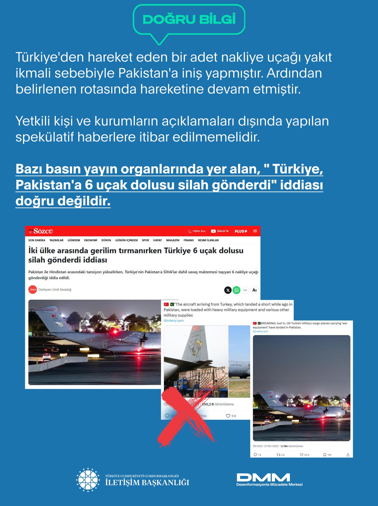 Bazı basın yayın organlarında yer alan, " Türkiye, Pakistan'a 6 uçak dolusu silah gönderdi." iddiası doğru değildir.