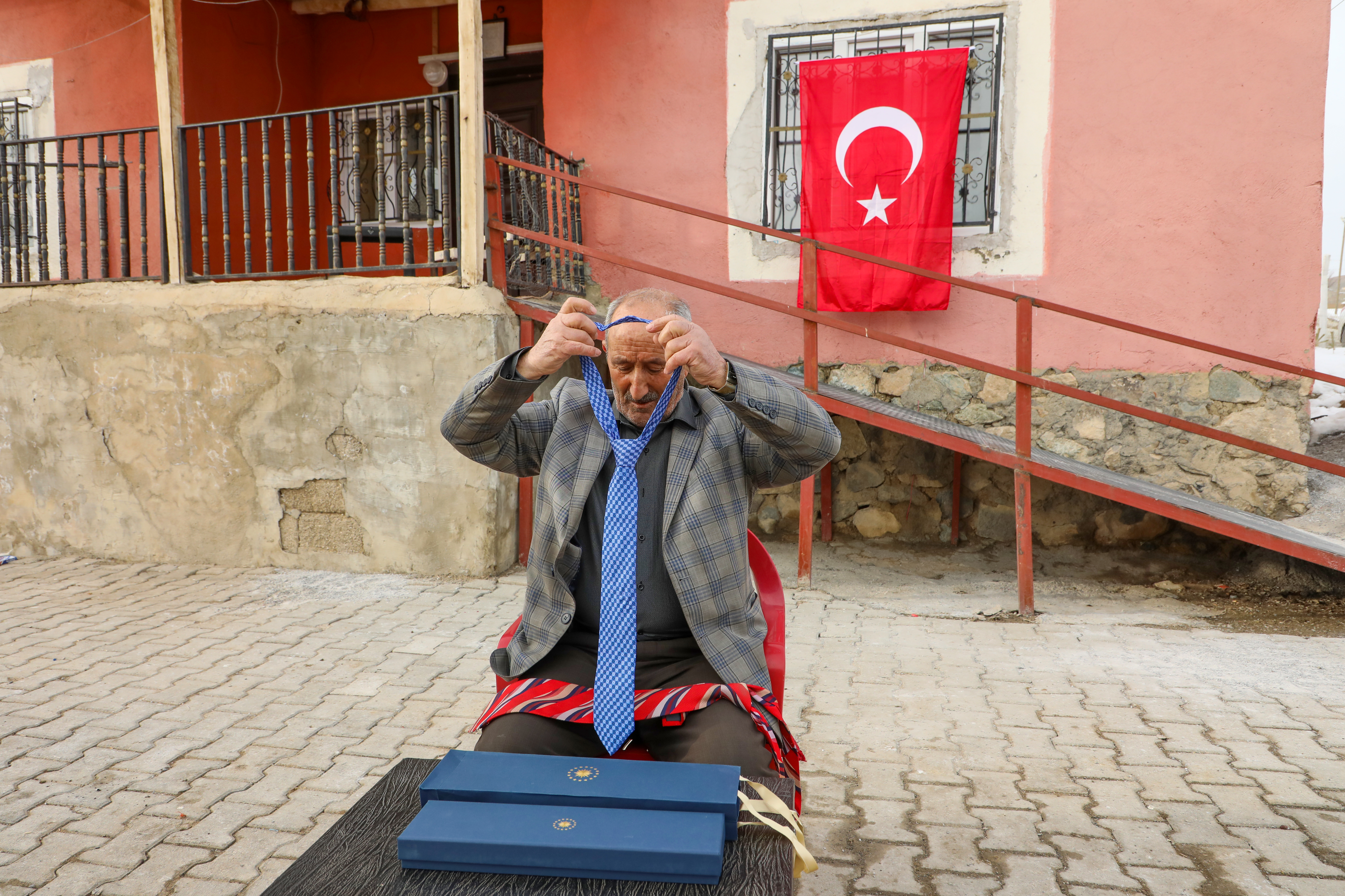 Van'ın Gürpınar ilçesinde kravata olan düşkünlüğüyle tanınan 70 yaşındaki Bedir Akbulut, koleksiyonuna, üzerinde Cumhurbaşkanı Recep Tayyip Erdoğan'ın isminin baş harflerinin bulunduğu kravatı eklemenin sevincini yaşıyor.