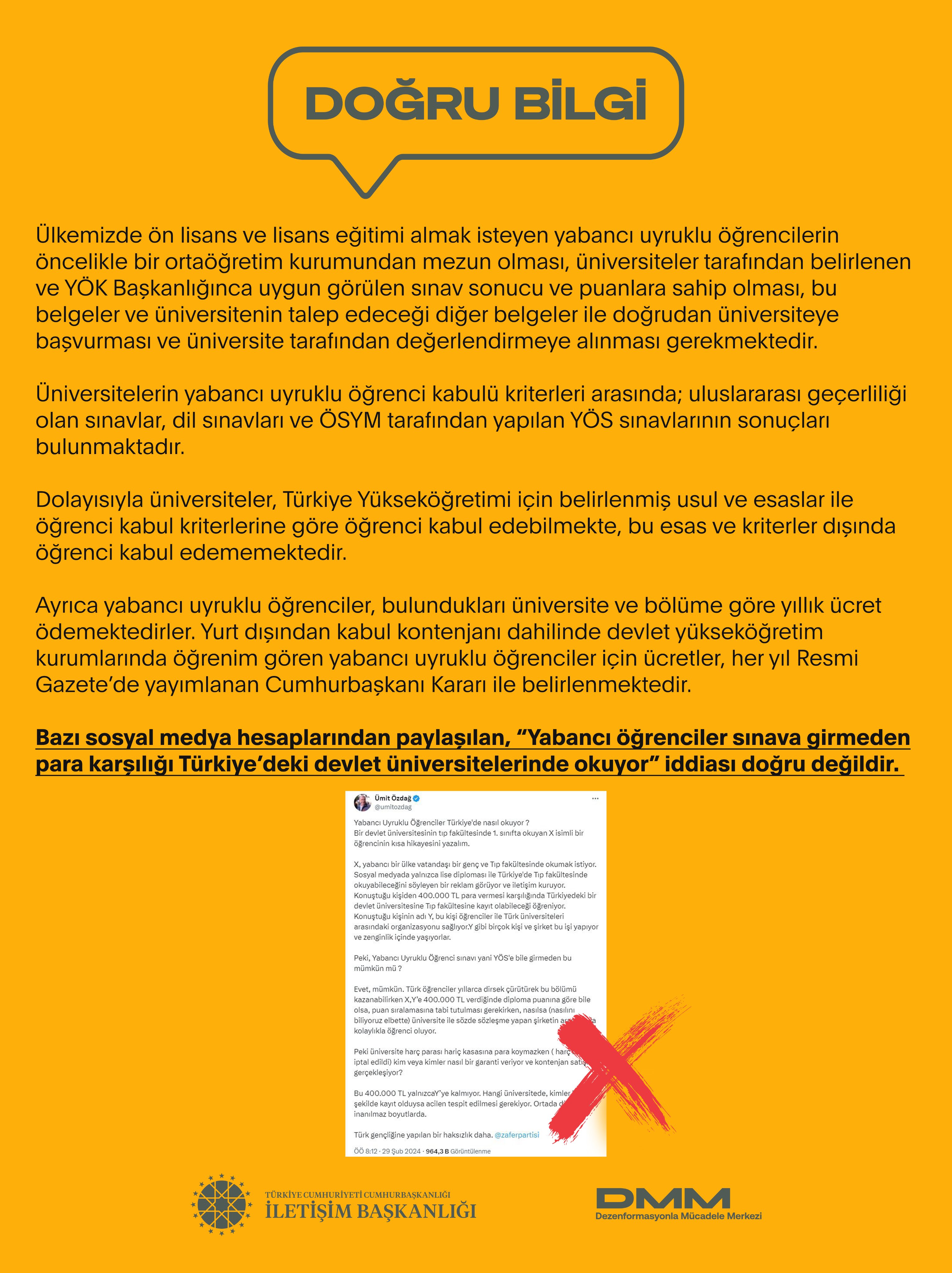 Bazı sosyal medya hesaplarından paylaşılan, “Yabancı öğrenciler sınava girmeden para karşılığı Türkiye’deki devlet üniversitelerinde okuyor” iddiası doğru değildir.