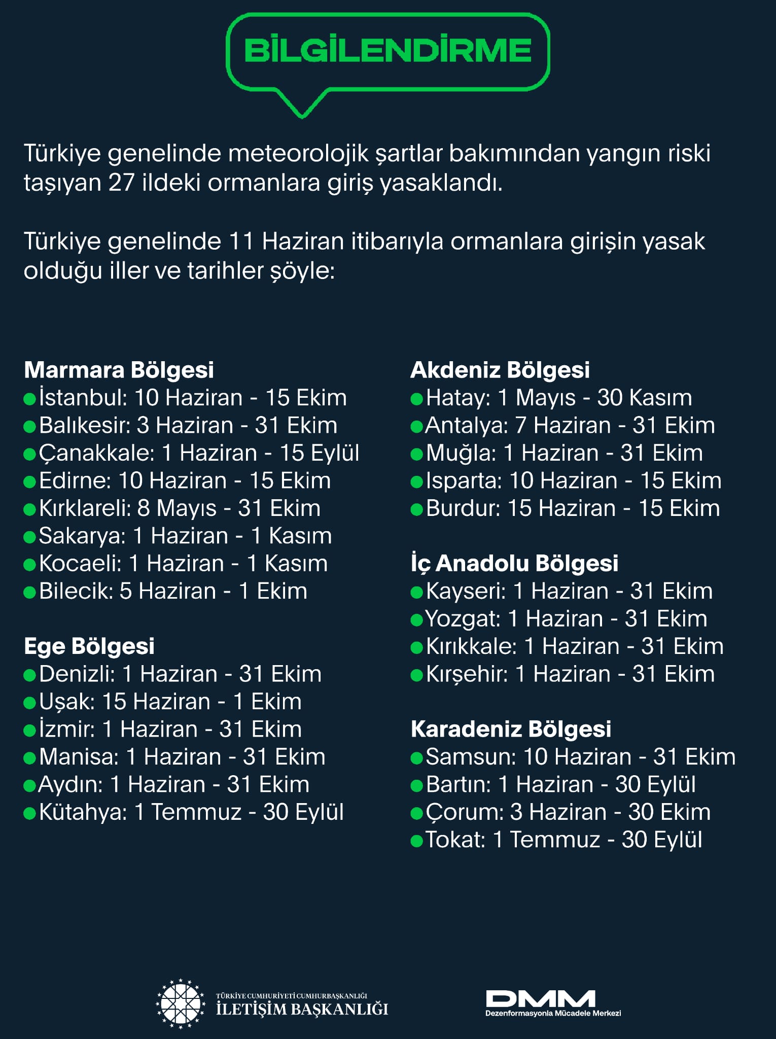 11 Haziran itibarıyla ormanlara girişin yasak olduğu iller ve tarihler şöyle: