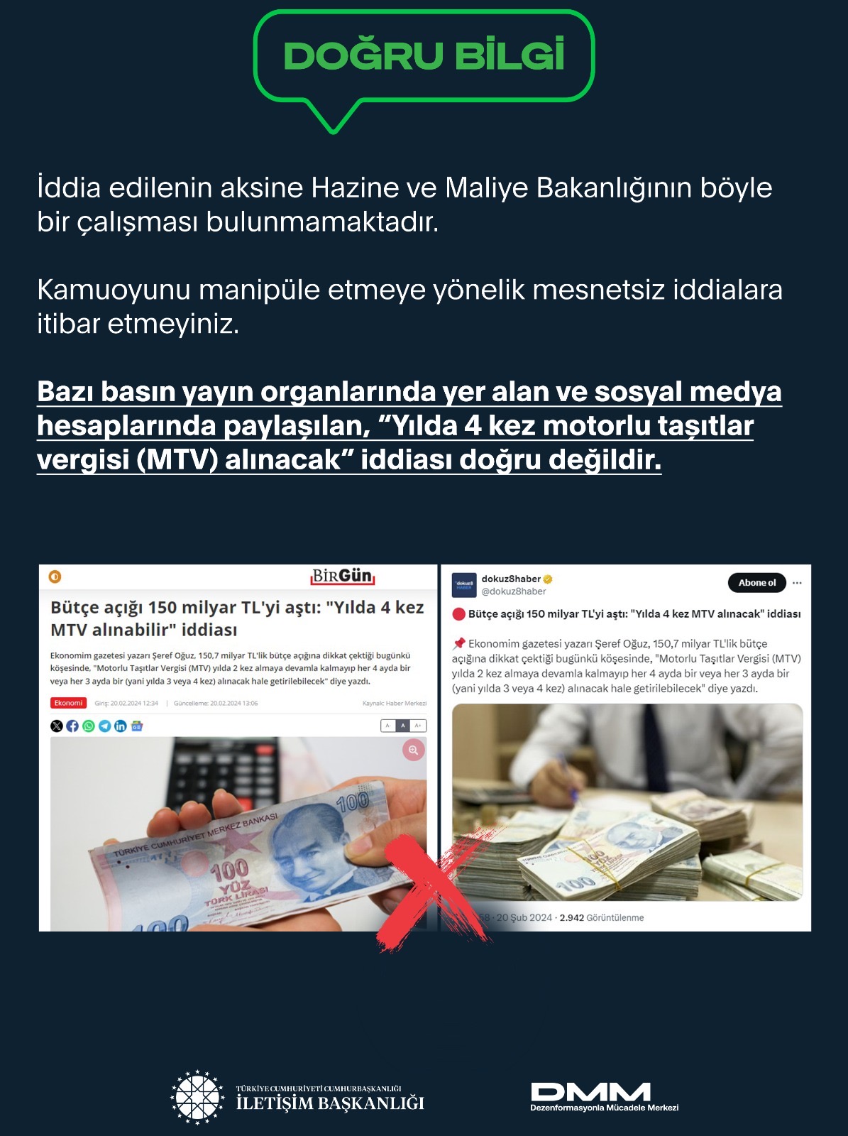 Bazı basın yayın organlarında yer alan ve sosyal medya hesaplarında paylaşılan, “Yılda 4 kez motorlu taşıtlar vergisi (MTV) alınacak” iddiası doğru değildir.